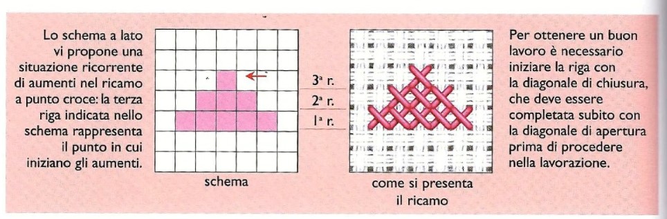 Questo è uno dei passaggi importanti da conoscere quando si ricama a punto croce. Gli aumenti a fine riga sono semplici da eseguire, basta infatti proseguire nella lavorazione fino al punto indicato dallo schema. Diverse invece è il modo di affrontare gli aumenti a inizio riga . In questa lezione vediamo come procedere.