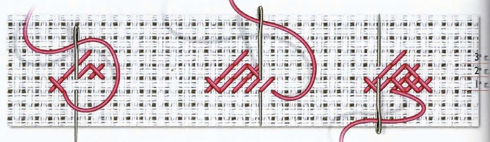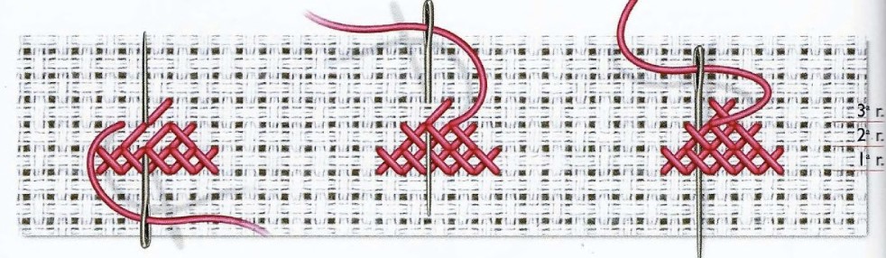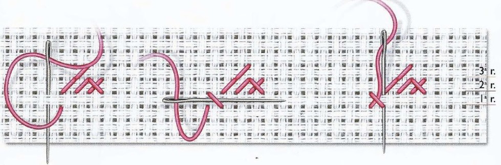 14 Girate ora l’ago con la punta rivolta verso il basso e completate il primo punto: terza riga dello schema.