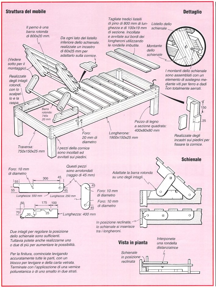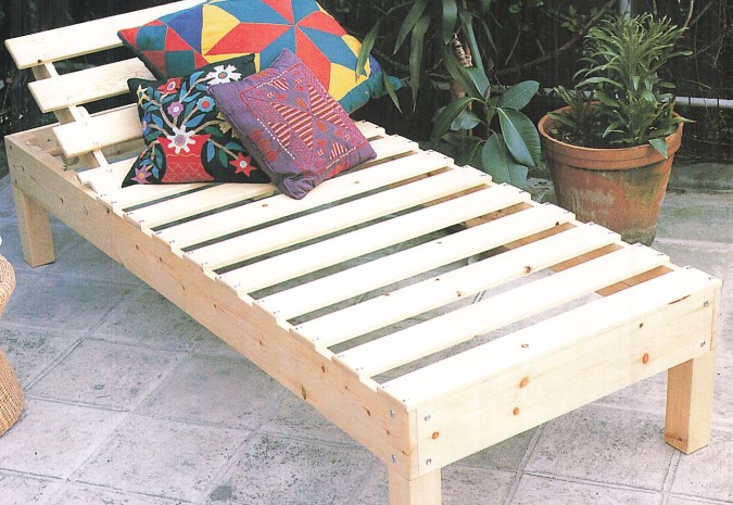 Questo mobile d’esterno, decorativo, solido e comodo, può essere ricoperto da un sottile materassino da spiaggia. Può anche essere utilizzato come tavolino per l’aperitivo o per gli spuntini. è realizzato in tavole di pino di buona qualità, trattate in precedenza contro l’umidità (poiché il letto è destinato a rimanere in giardino): potrete effettuare il trattamento voi stessi, con un prodotto impregnante, o acquistare del legno già trattato. In entrambi i casi, dovrete curare in modo particolare le parti terminali di ogni elemento.