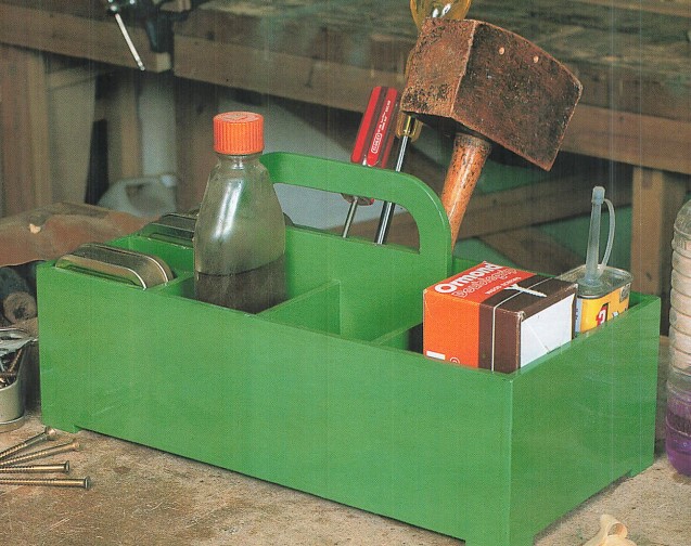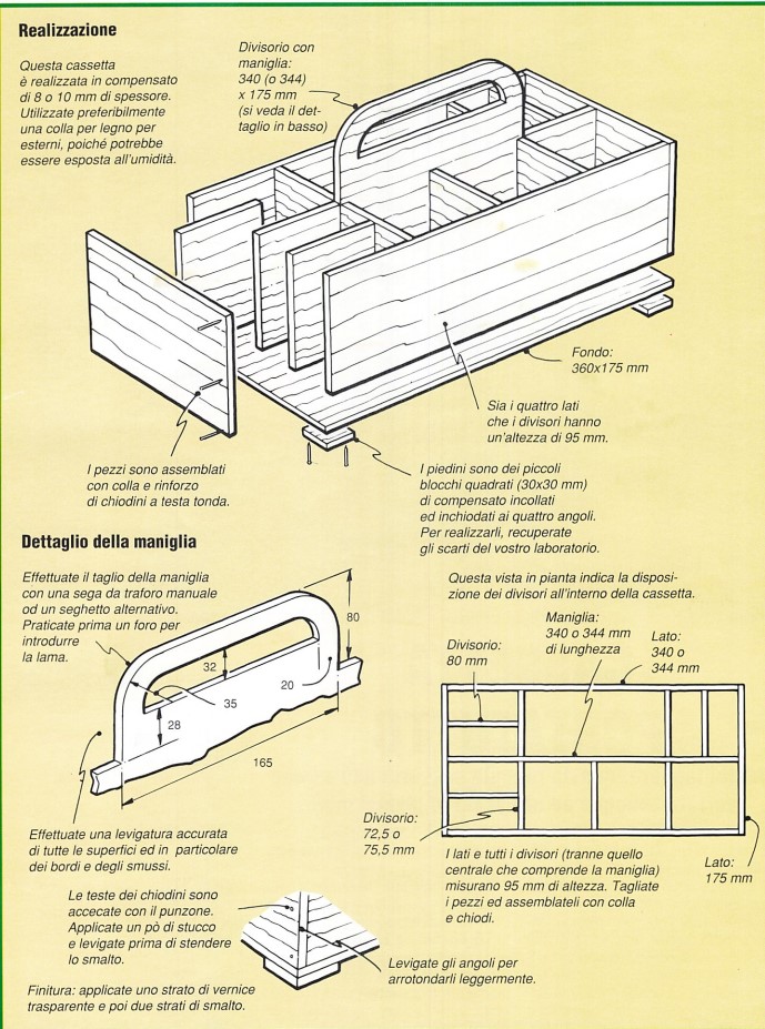 Una piccola cassetta per gli utensili, come quella che vi presentiamo, è concepita per trasportare gli attrezzi essenziali fino al luogo di lavoro. Tuttavia, può anche essere utilizzata nel vostro laboratorio per sistemare i piccoli utensili o nella vostra piccola serra per classificare i sacchettini di semenza. È realizzata in compensato (potrete utilizzare anche gli scarti). La sua realizzazione è semplice, poiché i pezzi sono assemblati con colla e rinforzo di chiodini a testa tonda (smussate le punte con un colpo di martello per evitare che l’impiallacciatura si scheggi). In fase di finitura. arrotondate i bordi con la carta vetrata e levigate tutte le superfici. Applicate uno strato di vernice trasparente, poi due strati di smalto (per decorare, ma anche per proteggere). Affinché la cassetta sia facilmente trasportabile, potete arrotolare attorno alla maniglia una cordicella (a spirali strette) o del nastro adesivo.