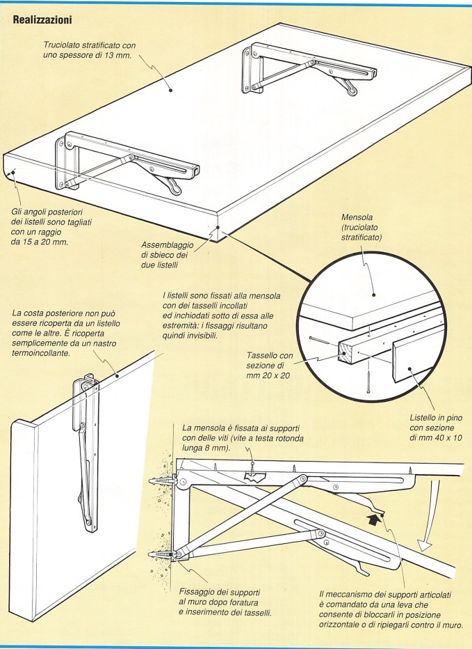 La realizzazione di questa mensola richiede un materiale molto limitato, tra cui due supporti articolati in acciaio smaltato. Questi supporti, il cui meccanismo consente di ripiegare la mensola contro il muro, hanno una resistenza tale da sostenere il peso di una colazione per due! Ma questo piano d’appoggio non serve soltanto per appoggiarvi delle stoviglie. Può anche essere collocato, ad esempio, nella camera dei bambini o in un locale riservato allo stiro ed al cucito. Per poter sostenere dei pesi notevoli, come ad esempio una macchina per cucire, la mensola deve essere fissata correttamente. Sarà quindi necessario utilizzare dei ganci ad espansione per muratura ed avvitare bene la mensola ai supporti per evitare che scivoli, La mensola è tagliata in un pannello di truciolato stratificato dello spessore minimo di 13 mm, resistente al caldo e di facile manutenzione. Le sue dimensioni, in particolare la larghezza, saranno scelte in base allo spazio di cui disponete, I lati visibili della mensola saranno nascosti con dei listelli di pino larghi 40 mm e con uno spessore di 10 mm tagliati di sbieco. L’aspetto naturale del legno verrà conservato ricoprendo questi listelli con uno strato di vernice trasparente, che li proteggerà e faciliterà la loro manutenzione. Una volta preparato il ripiano, fisserete i due supporti al suo lato interno, ad una distanza uguale da ogni lato, nel centro della costa posteriore, Poi, decidete a quale altezza deve essere fissata la mensola sul muro e segnatevi, attraverso i fori di fissaggio dei supporti, la posizione esatta dove praticherete i fori: durante l’operazione, ponete sulla mensola una livella.